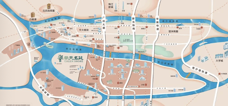 答:洛溪岛是广州城市中轴(南延线)穿过的江心岛,被视为“第二中轴岛”。南天名苑位于该岛的尖端,三面环抱珠江,具有约2。3公里私人江岸线度江景,是广州市核心极为稀缺的半岛型低密生态住区。